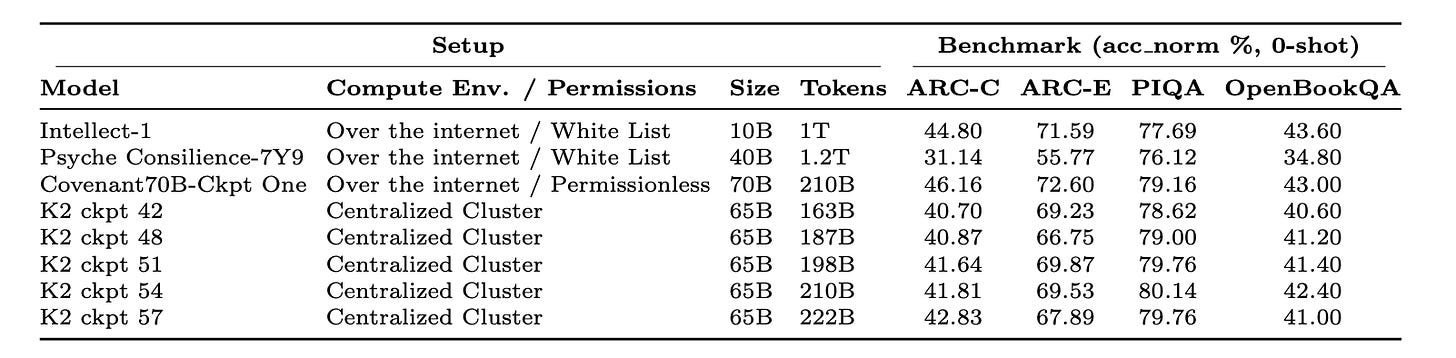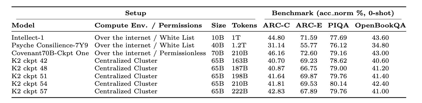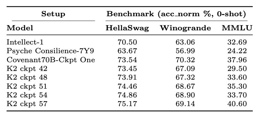 In the tables below, we compare our first checkpoint against two other decentralized pre-training runs (conducted with white listed participants unlike our permissionless runs) and several K2 checkpoints at similar training stages.